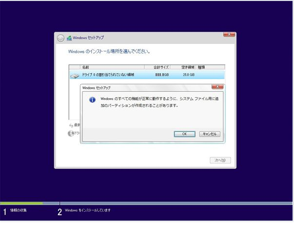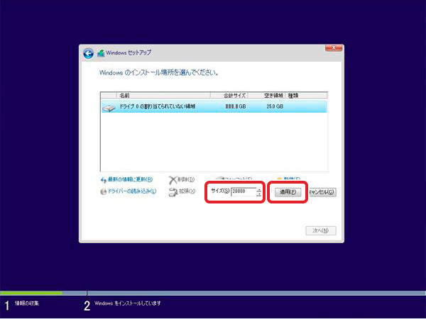 ドライブオプション 詳細を押し、手動でパーテーションを割り当てる。